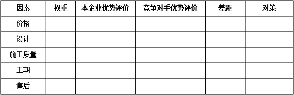 F、關(guān)鍵成交因素對(duì)比:對(duì)于某一個(gè)細(xì)分領(lǐng)域的客戶而言,成交的關(guān)鍵因素選項(xiàng)是相對(duì)清晰的,而這些因素對(duì)成交的影響權(quán)重是不同的,經(jīng)營分析就需要識(shí)別競爭對(duì)手在哪些關(guān)鍵成交因素上占據(jù)優(yōu)勢(shì)。例如:對(duì)于裝飾裝修工程行業(yè)的家庭客戶而言,其成交因素包括:價(jià)格、設(shè)計(jì)、施工質(zhì)量、工期、售后的維修維保服務(wù)等。對(duì)于一個(gè)收入中等的自住新房客戶而言,價(jià)格、設(shè)計(jì)因素、施工質(zhì)量是其主要成交因素,而對(duì)于商鋪、投資房產(chǎn)來說,工期的重要性不言而喻。如下表: